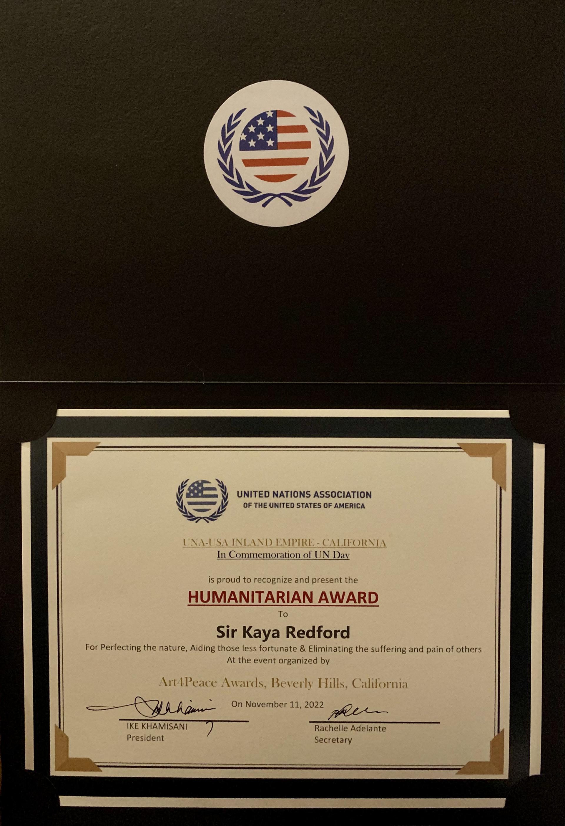 The UNITED NATIONS is Proud to Recognize & Present The Humanitarian Award to Sir Kaya Redford. For perfecting the nature, Aiding those less fortunate & Eliminating the suffering and pain of others.